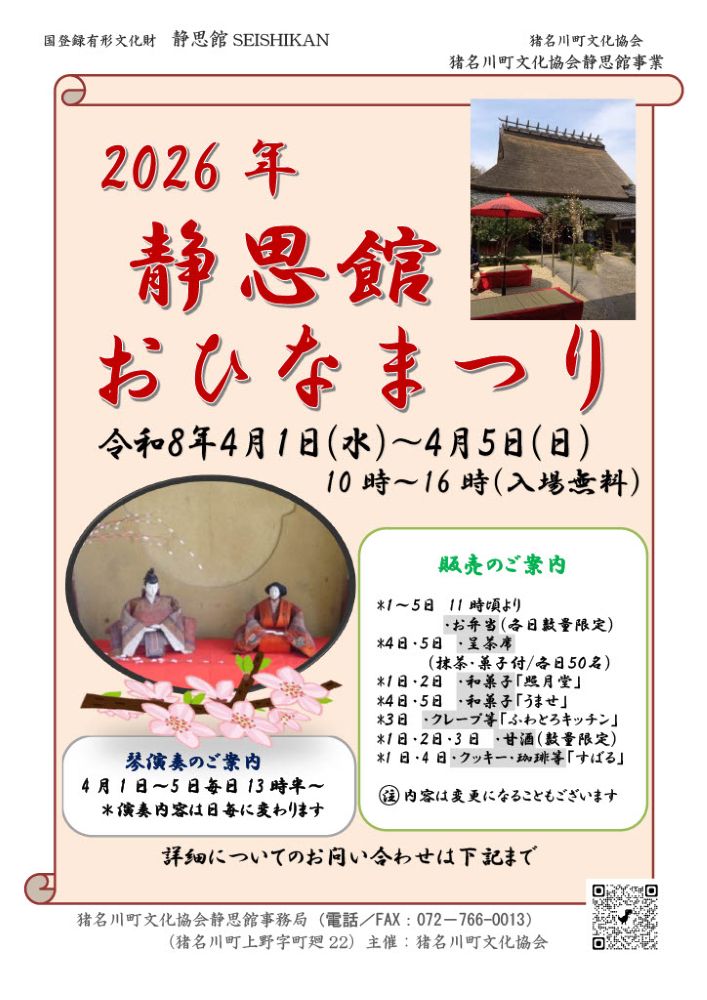 静思館おひなまつり 新着情報 2026.02.21 今年のお知らせポスターです お弁当販売の出店予定 *変更になることもあります。 ・創作和食&カフェ 想月(猪名川町) ・カフェ&パティスリー ふくふく(能勢) ・たけのかぜ(能勢) ・カフェ&レストラン ザ・グラスホッパー(尼崎) ・ホロイムア(尼崎) Post 野島レナ サクソフォンリサイタル開催 3月8日(日) 新着記事 お知らせ一覧 2026.02.16 野島レナ サクソフォンリサイタル開催 3月8日(日) 2026.01.13 静思館おひなまつり2026 開催のお知らせ 2026.01.02 初釜 令和8年1月25日(日)10時~15時 2025.12.10 猪名美ロビー展12月度 開催中(令和8年1月6日まで) 2025.10.27 第37回猪名美展 11月9日(日)~14日(金) サピエギャラリーにて